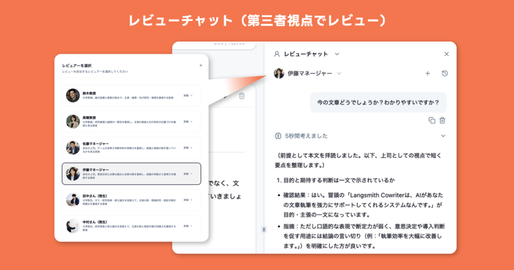 「この段落の主張を強くしたい」「具体例を足したい」「読者に伝わるか不安」といった相談相手が欲しい場面で、専門家の視点で応答するAI(例:教授や上司ロールのAI)がアドバイスをくれます。