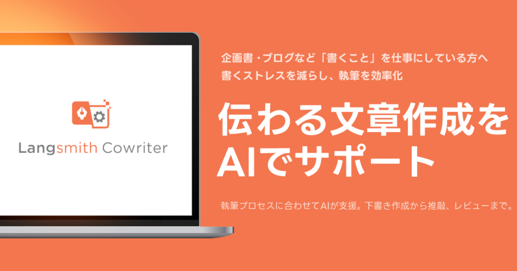 Langsmith Cowriter(ラングスミスコライター)は、論理的な構成力が求められるビジネス文書から、感性が重視される創作活動まで、企画書・広報資料・研究レポート・ブログ・小説など、あらゆる「書く」シーンで伴走する専属編集者として機能し、下書き作成だけでなく、改善提案やレビューを通じて仕上げまで支援します。